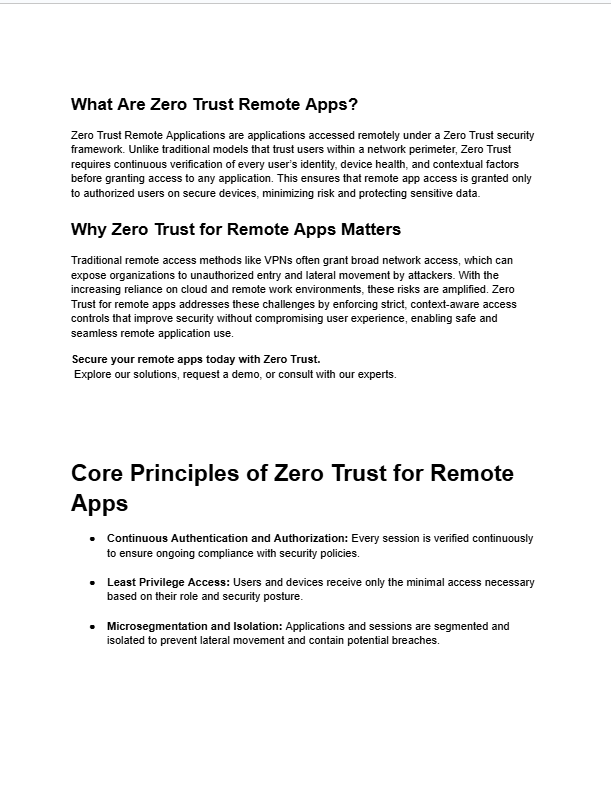 Zero Trust Remote Applications are applications accessed remotely under a Zero Trust security framework. Unlike traditional models that trust users within a network perimeter, Zero Trust requires continuous verification of every user’s identity, device health, and contextual factors before granting access to any application.